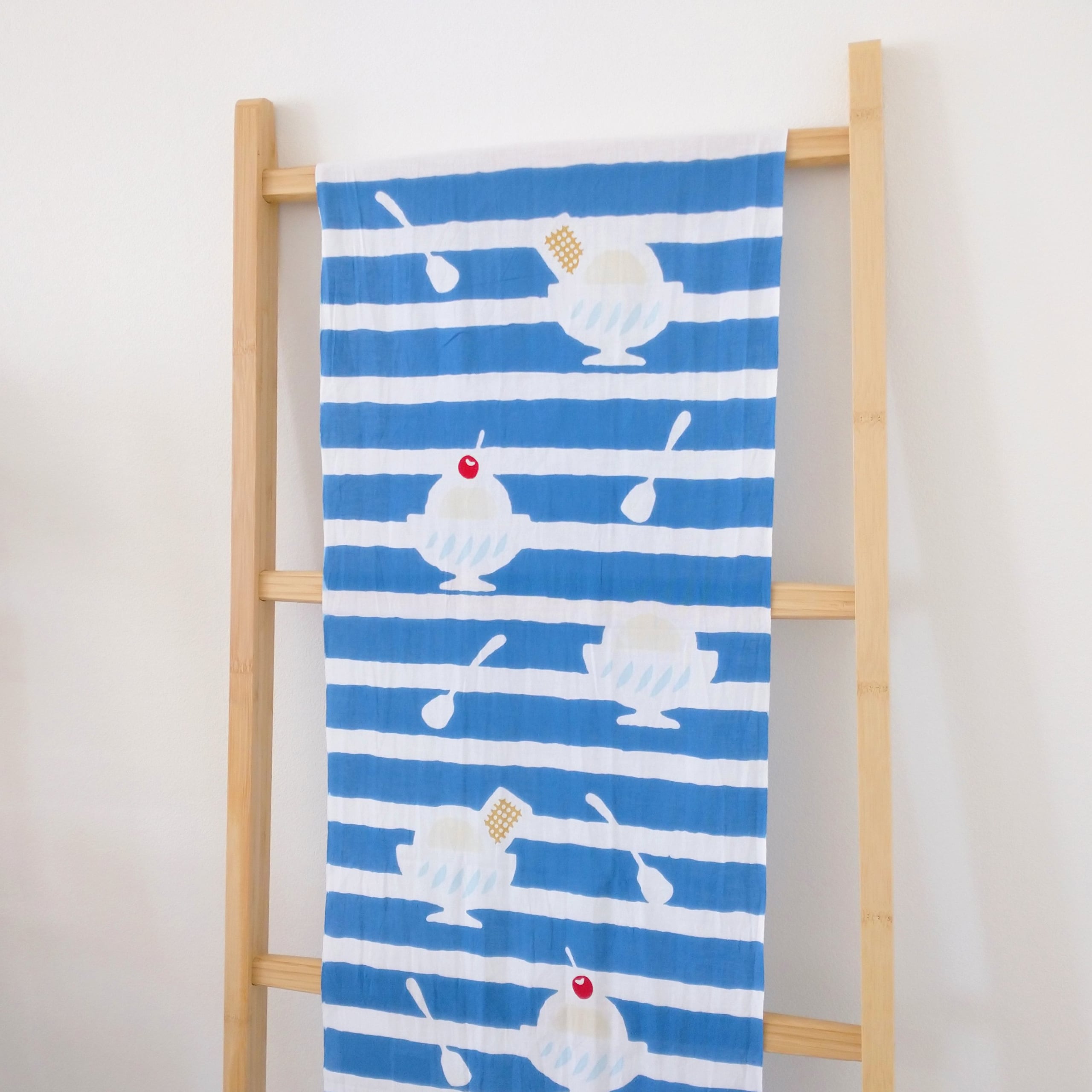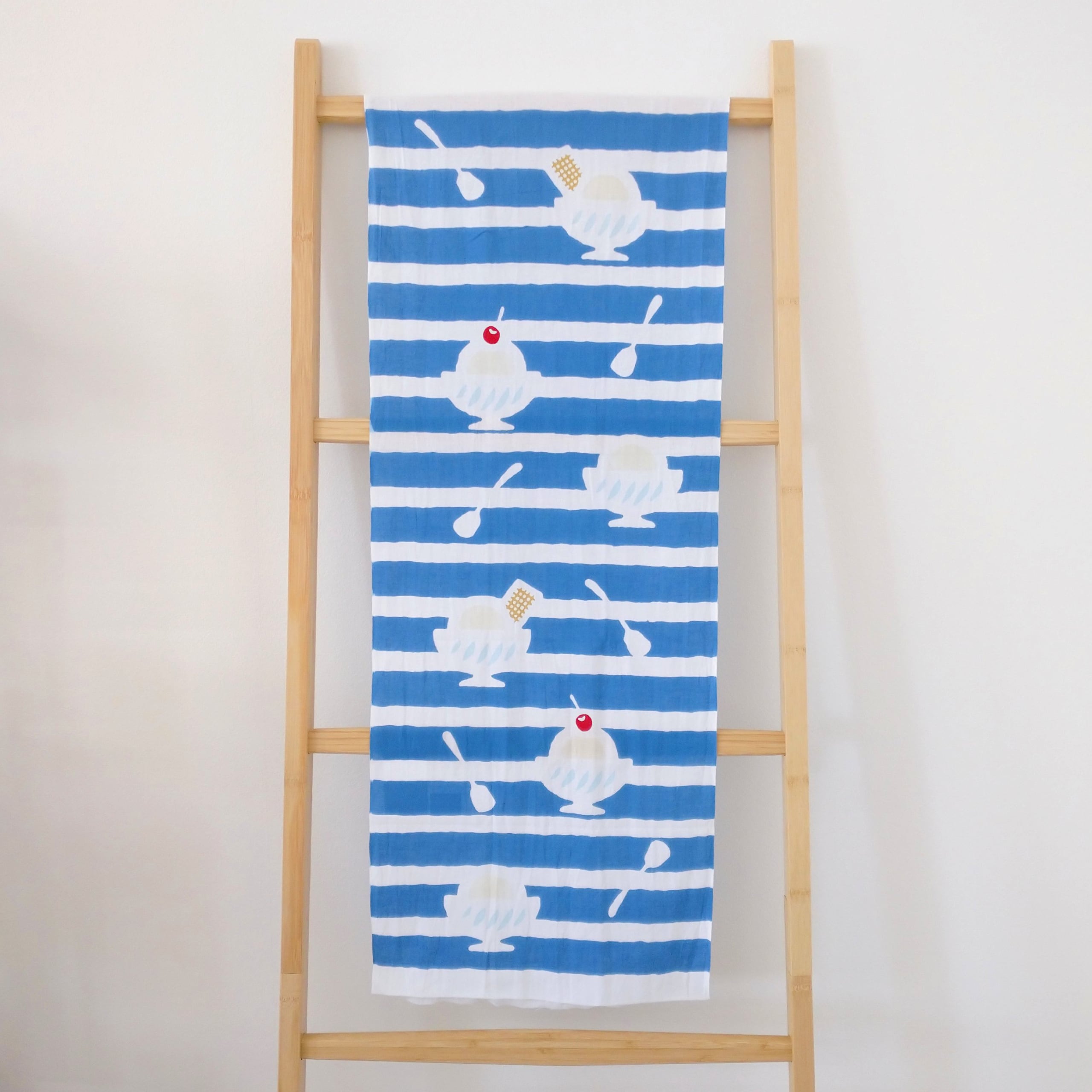 喫茶店のメニューにあるようなどこか懐かしい雰囲気のアイスクリームが、夏らしい爽やかなボーダー柄になりました。暑い夏にひんやりと、楽しい気分を届けてくれる一枚です。