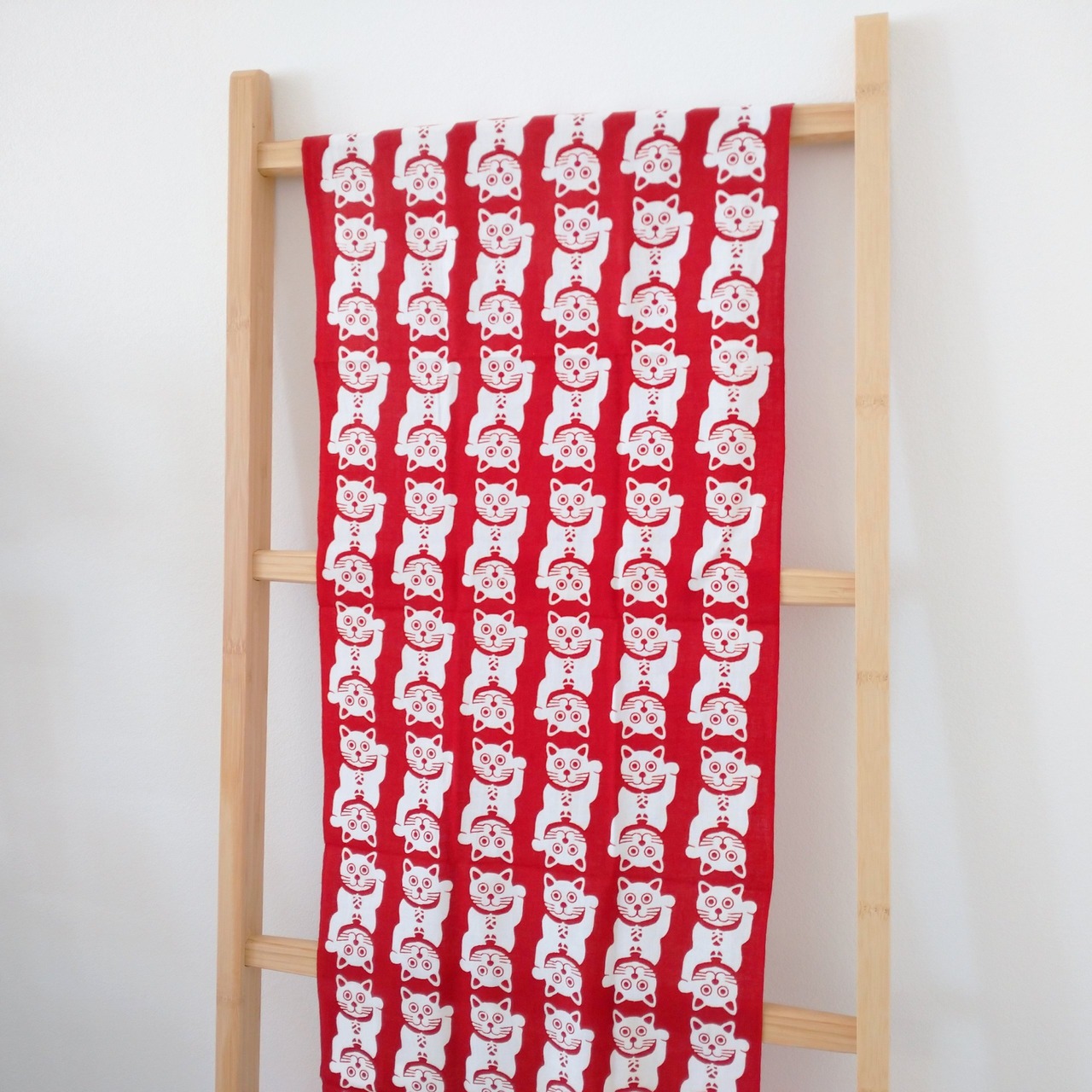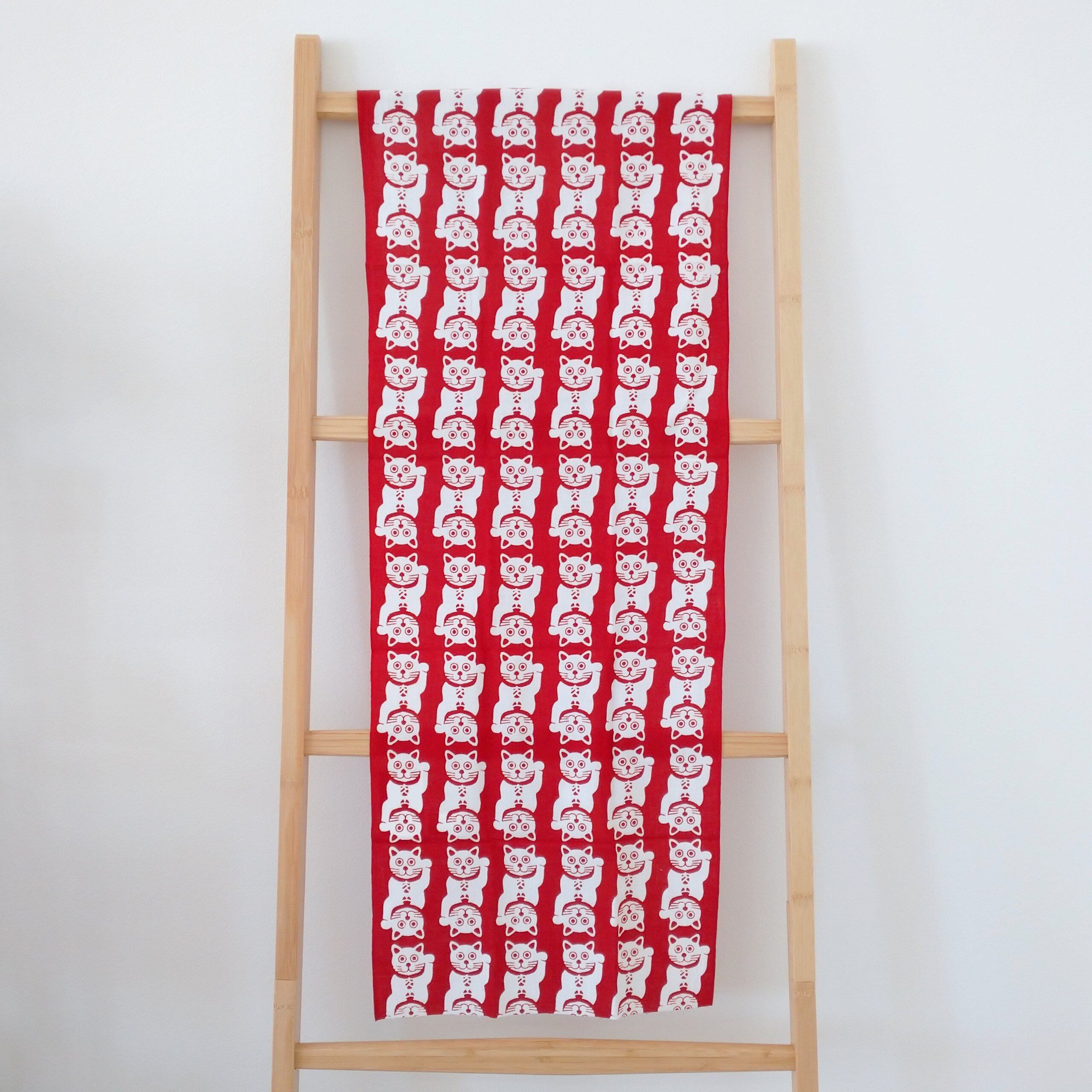 右手を挙げている猫は金運を招き、左手を挙げている猫は人(客)を招くとされています。赤い招き猫は厄除けの意味があります。首には「大入」と書かれた小判をつけています。